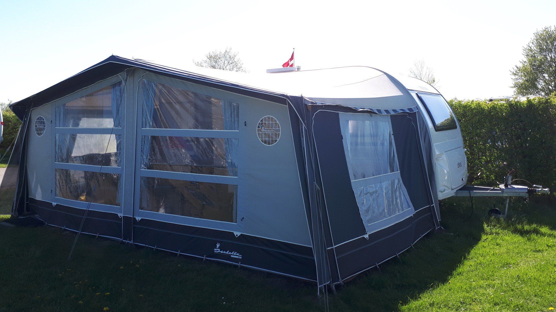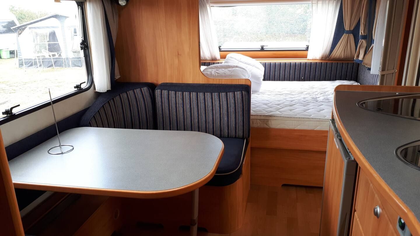 Forteltet er møbleret med køleskab og har bordplads/stole til seks personer. Der er dyner og hovedpuder i vognene.
