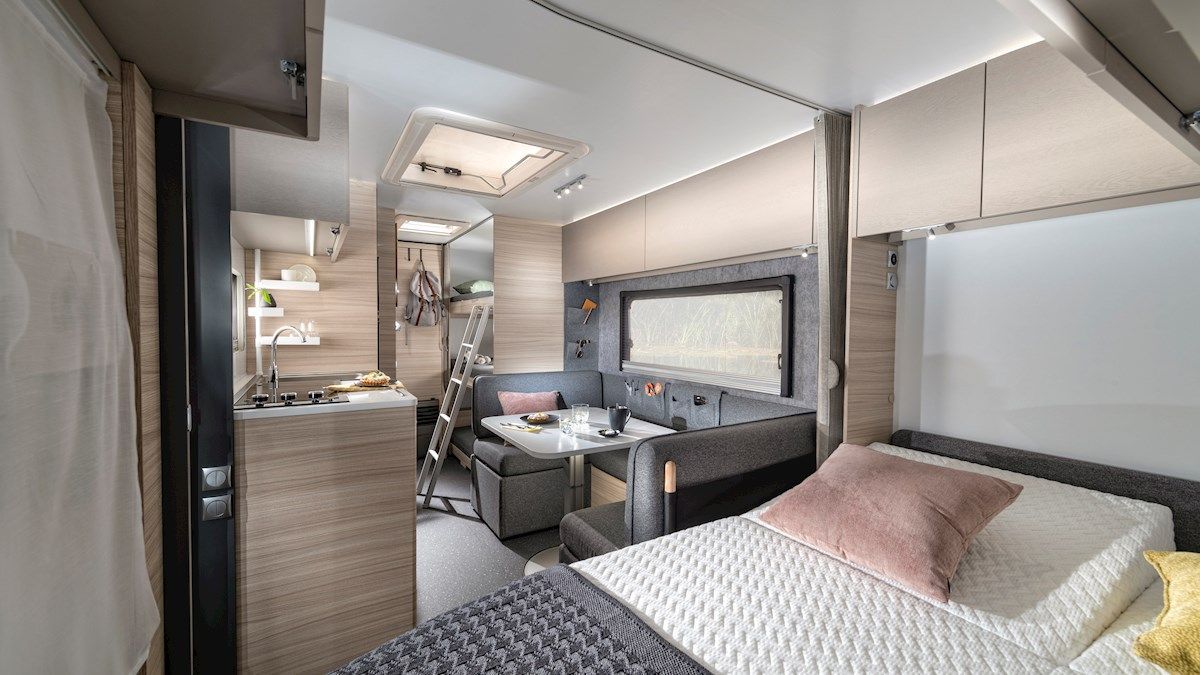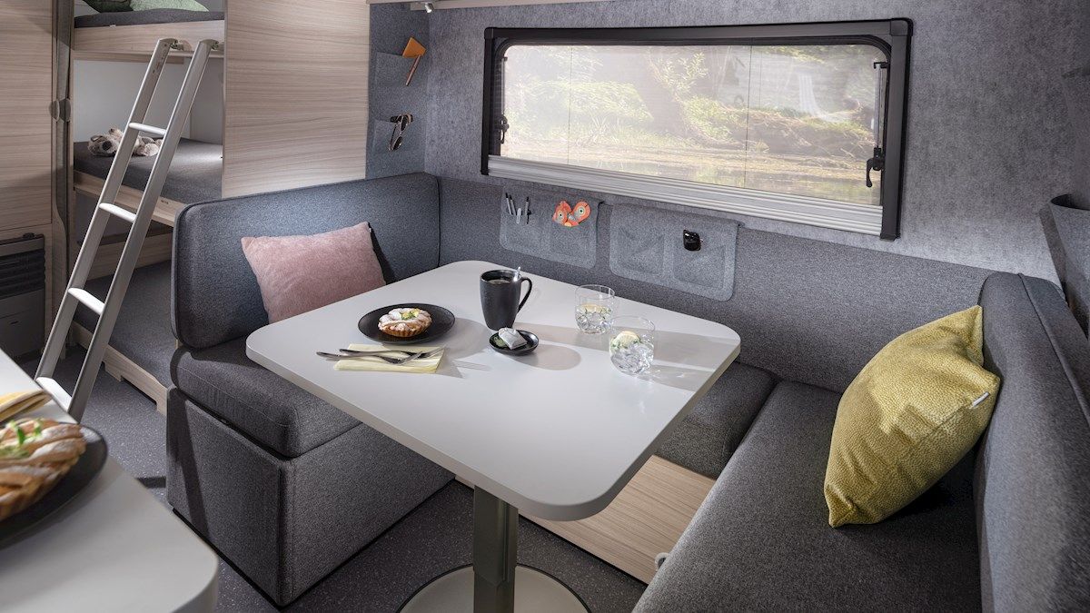 Vores luksusvogne er den familievenlige Adria PK552 med plads til seks personer (fordelt med dobbeltseng og 3 køjesenge samt mulighed for opredning i siddegruppe).
